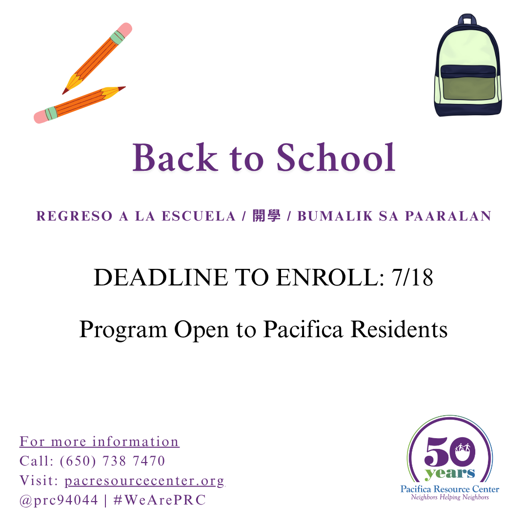 Guest User June 23, 2025 PRC's 2025 Back to School Program Guest User June 23, 2025 PRC’s Back to School Program provides kindergarten through high school students residing in Pacifica with a new backpack and gift cards to purchase school supplies.*STUDENTS MUST RESIDE IN PACIFICA* Interested in signing up for Back to School? Call To Enroll Interested in donating to the Program? Target Wish list MAKE A DONATION